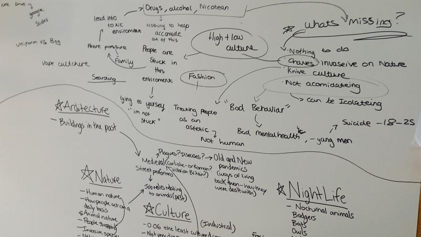 After discussing our findings, Inspired by Eve's research, we got into a discussion around the disenfranchised youth of Cumbria, the hardships they face and how we could shed light on these issues to create meaningful artwork.